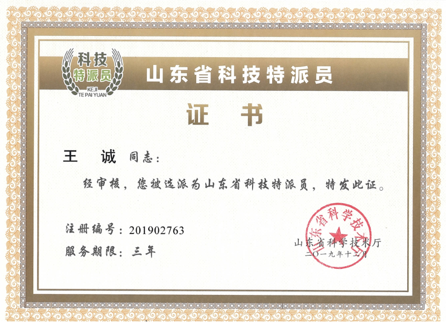 祝賀山東健源生物科技有限公司董事長王誠先生被選任為山東省科技特派員