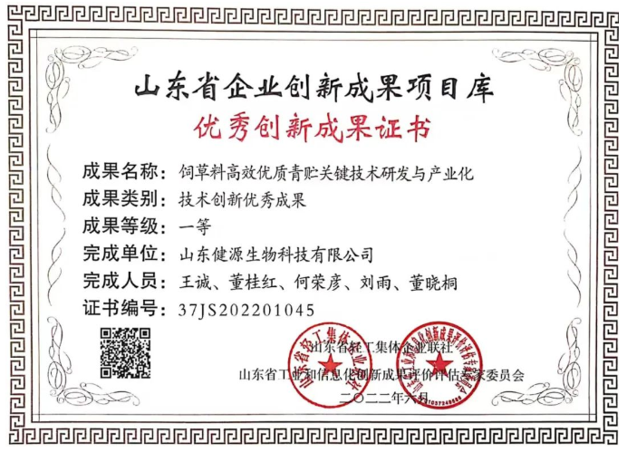 發布時間:[2022-7-15 11:33:13] 瀏覽量:3970次根據山東省輕工集體企業聯社發布《關于公布企業技術創新成果項目的通知 》(魯輕聯企[2022]18號),經各市中小企業主管部門、行業協會、服務機構初審,專家評審,公示和異議復核等程序,山東健源生物科技有限公司提報的《飼草料優質青貯關鍵技術研發與產業化》成果榮獲山東省企業創新成果項目庫 “技術創新優秀成果一等獎”。