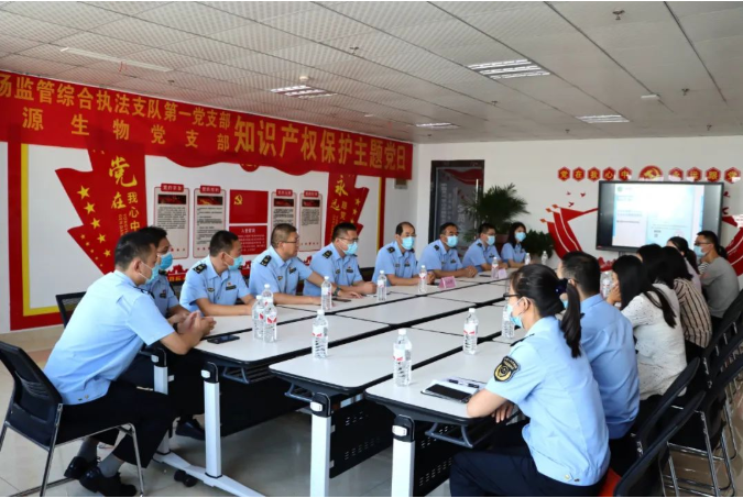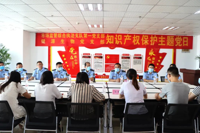 服務經濟發展,賦能強市建設。2022年9月2日,山東健源生物黨支部與泰安市市場監管綜合執法支隊黨支部聯合開展"知識產權保護主題黨日"活動,增強企業知識產權保護意識。泰安市市場監管綜合執法支隊副支隊長孫鳳明、任常平帶領第一支部12名黨員參加,山東健源生物行政副總經理王玲、技術研發部主任董桂紅等相關部門負責人一同參與活動。