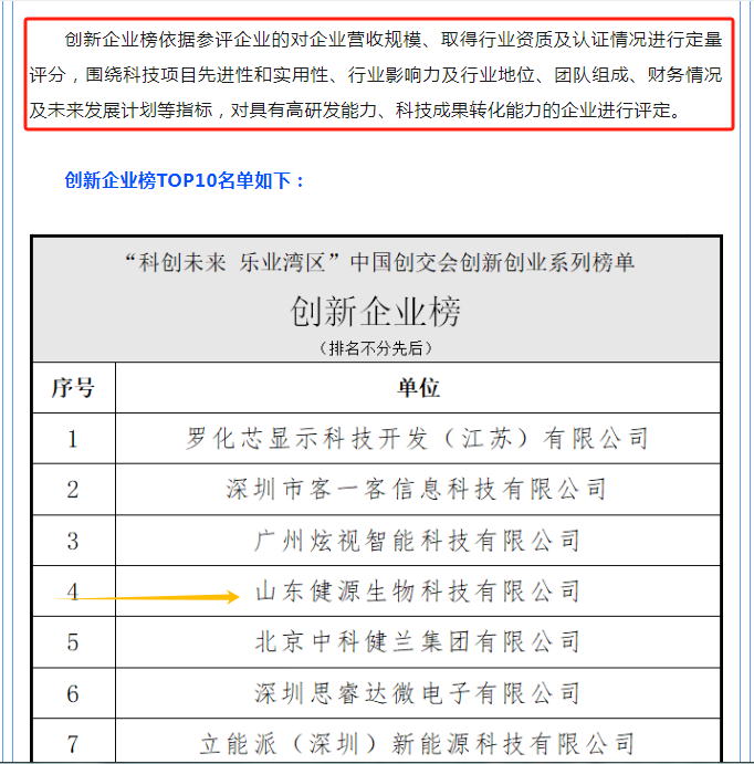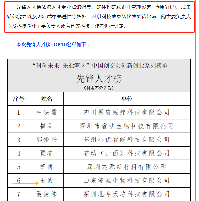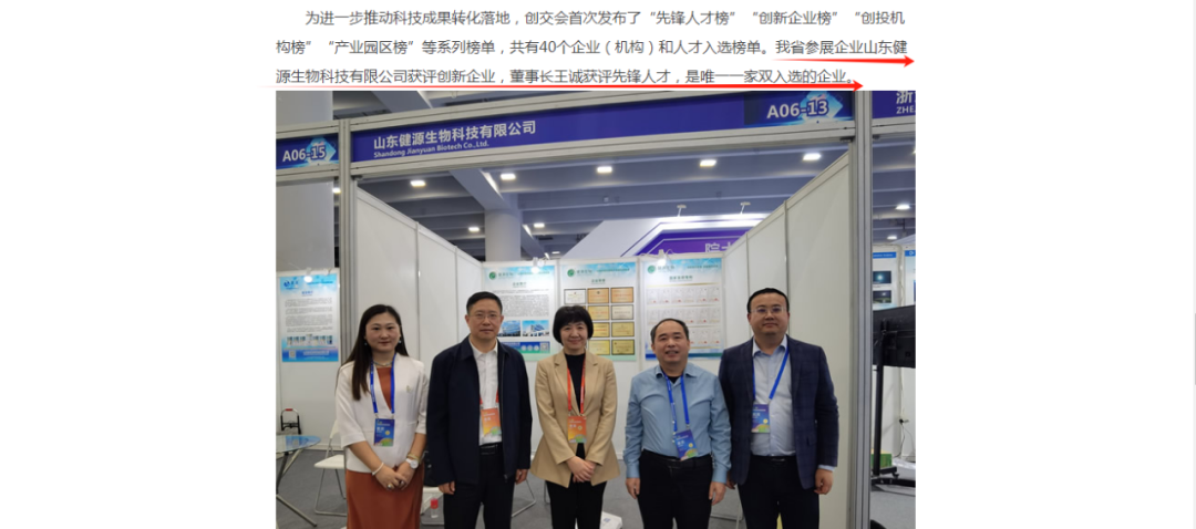 2023中國(guó)創(chuàng)新創(chuàng)業(yè)成果交易會(huì)于11月17日至19日在廣州舉辦。山東健源生物科技有限公司入選創(chuàng)新企業(yè)榜TOP10,董事長(zhǎng)王誠(chéng)入選先鋒人才榜TOP10,是山東省參展企業(yè)中唯一一家雙入選企業(yè)。