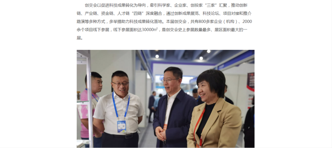 創(chuàng)交會(huì)在高端人才成果展區(qū)設(shè)立九三學(xué)社專(zhuān)區(qū),130家社員企業(yè)參展。九三學(xué)社中央社會(huì)服務(wù)部副部長(zhǎng)蔣承華,山東省政協(xié)副秘書(shū)長(zhǎng)、九三學(xué)社山東省委會(huì)專(zhuān)職副主委李宗濤,九三學(xué)社泰安市委會(huì)秘書(shū)長(zhǎng)郭啟明相繼來(lái)到公司展位,聽(tīng)取項(xiàng)目介紹,詳細(xì)了解成果轉(zhuǎn)化和市場(chǎng)前景等情況,鼓勵(lì)企業(yè)要充分發(fā)揮科技創(chuàng)新優(yōu)勢(shì),積極服務(wù)地方經(jīng)濟(jì)社會(huì)發(fā)展。