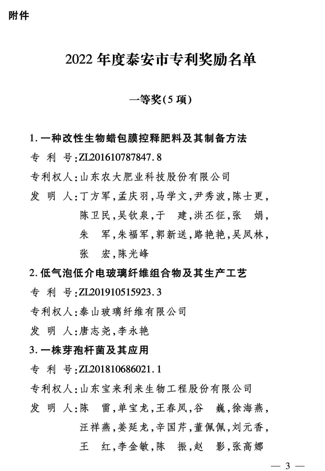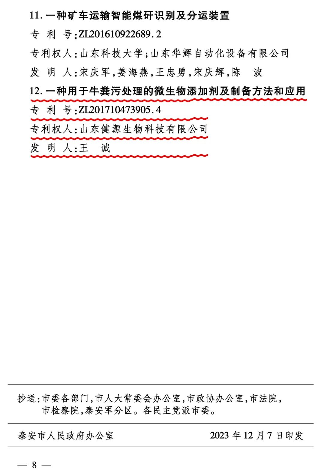 12月7日,泰安市人民政府發(fā)布關(guān)于2022年度泰安市專利獎勵的決定(泰政字【2023】74號),山東健源生物科技有限公司的“一種用于牛糞污處理的微生物添加劑及制備方法和應(yīng)用”獲全市專利三等獎。