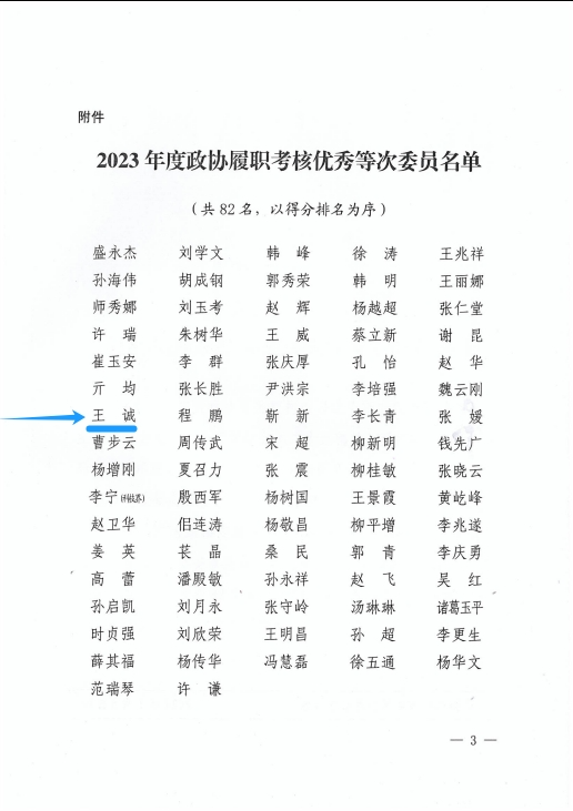 2023年,廣大政協(xié)委員堅(jiān)持以習(xí)近平新時(shí)代中國(guó)特色社會(huì)主義思想為指導(dǎo),全面貫徹黨的二十大精神,圍繞中心、服務(wù)大局、高標(biāo)準(zhǔn)履職、高效率作為,為全面開(kāi)創(chuàng)新時(shí)代社會(huì)主義現(xiàn)代化強(qiáng)市建設(shè)新局面貢獻(xiàn)了智慧和力量。為表?yè)P(yáng)先進(jìn),會(huì)上公布了2023年度政協(xié)履職考核優(yōu)秀等次委員名單,董事長(zhǎng)王誠(chéng)光榮上榜!