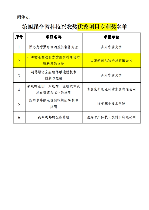 山東健源生物科技有限公司申報(bào)的《一種微生物秸稈發(fā)酵劑及其發(fā)酵秸稈的方法》項(xiàng)目獲得山東省農(nóng)業(yè)科技轉(zhuǎn)化促進(jìn)會(huì)科技興農(nóng)獎(jiǎng)優(yōu)秀項(xiàng)目獎(jiǎng)專利獎(jiǎng)。健源生物旗下子公司山東寵言生物科技有限公司申報(bào)的《寵物清潔健康養(yǎng)殖關(guān)鍵技術(shù)研發(fā)與應(yīng)用》項(xiàng)目獲得山東省農(nóng)業(yè)科技促進(jìn)會(huì)科技興農(nóng)獎(jiǎng)優(yōu)秀項(xiàng)目獎(jiǎng)一等獎(jiǎng),董事長(zhǎng)王誠(chéng)為兩個(gè)項(xiàng)目的第一完成人。