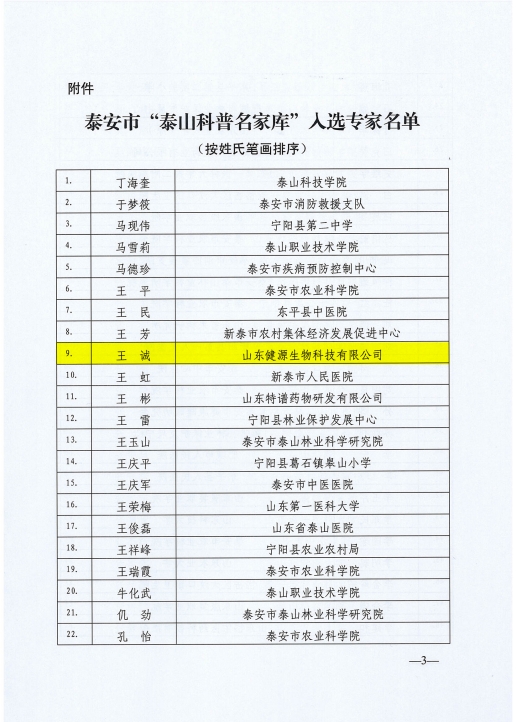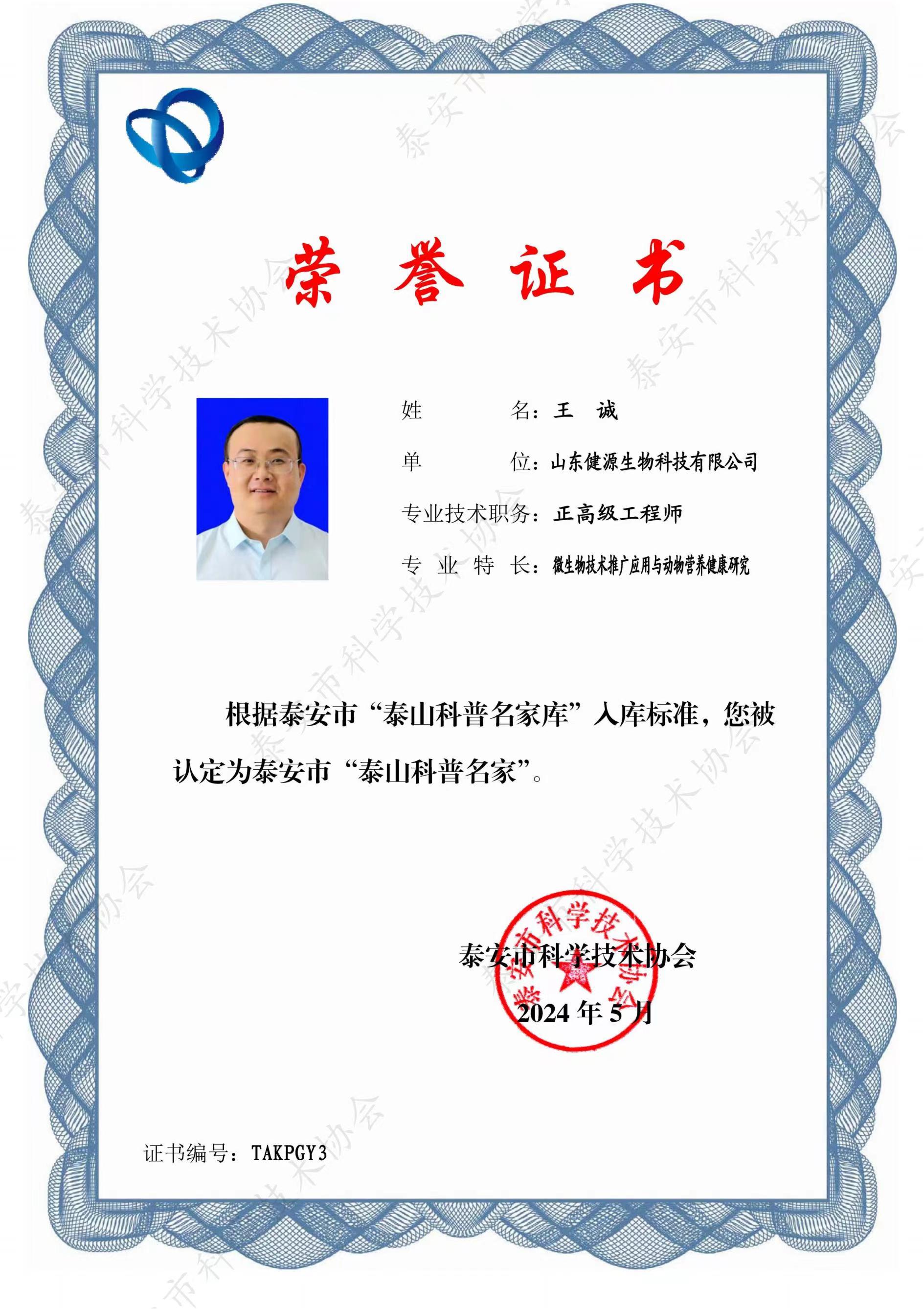 發布時間:[2024-6-6 16:33:30] 瀏覽量:2927次近日,泰安市科學技術協會公布了泰安市“泰山科普名家庫”入選專家名單,根據泰安市“泰山科普名家庫”入庫標準,山東健源生物科技有限公司董事長王誠被認定為泰安市“泰山科普名家”。