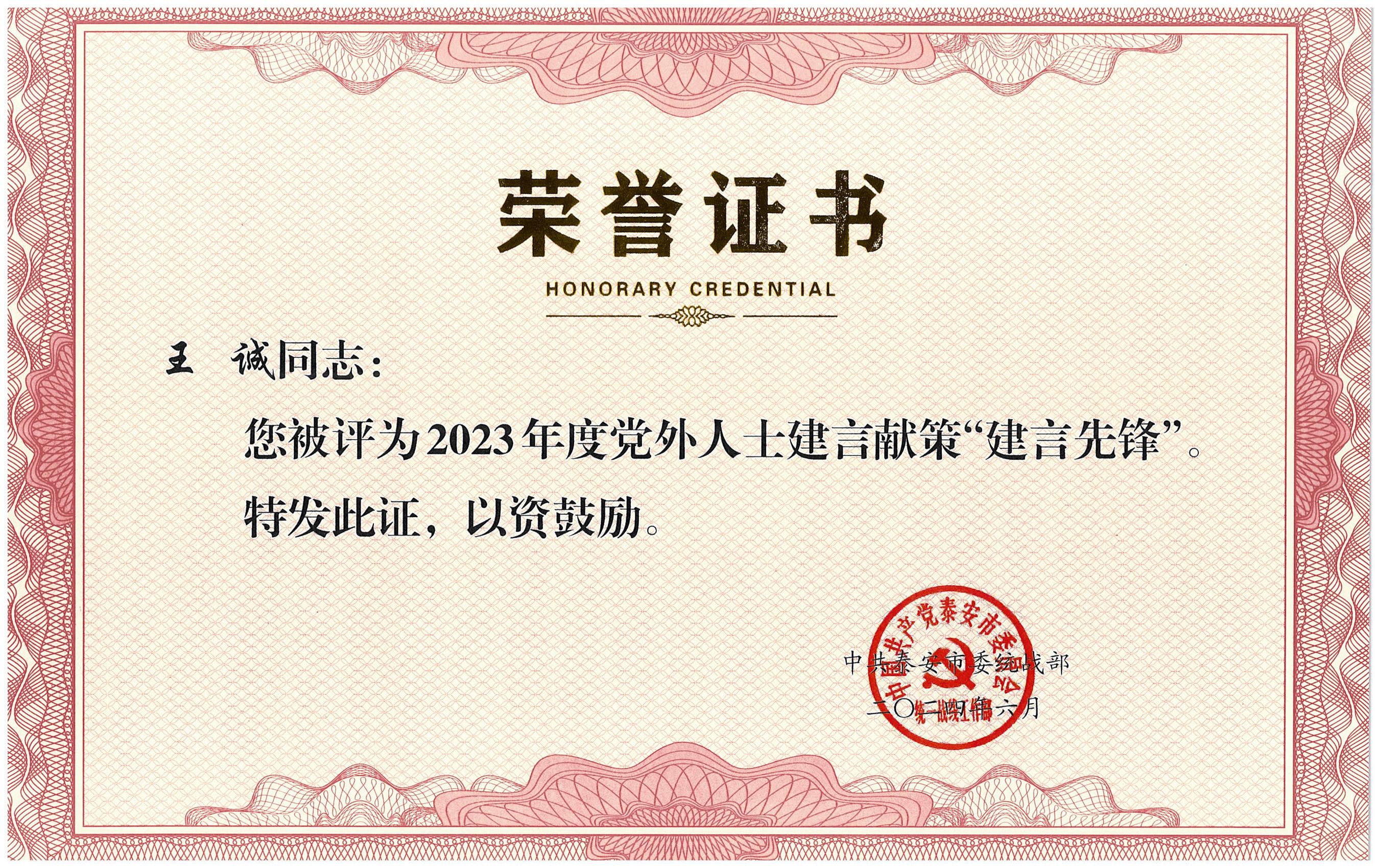 王誠董事長榮獲中共泰安市委統(tǒng)戰(zhàn)部多項榮譽(yù)