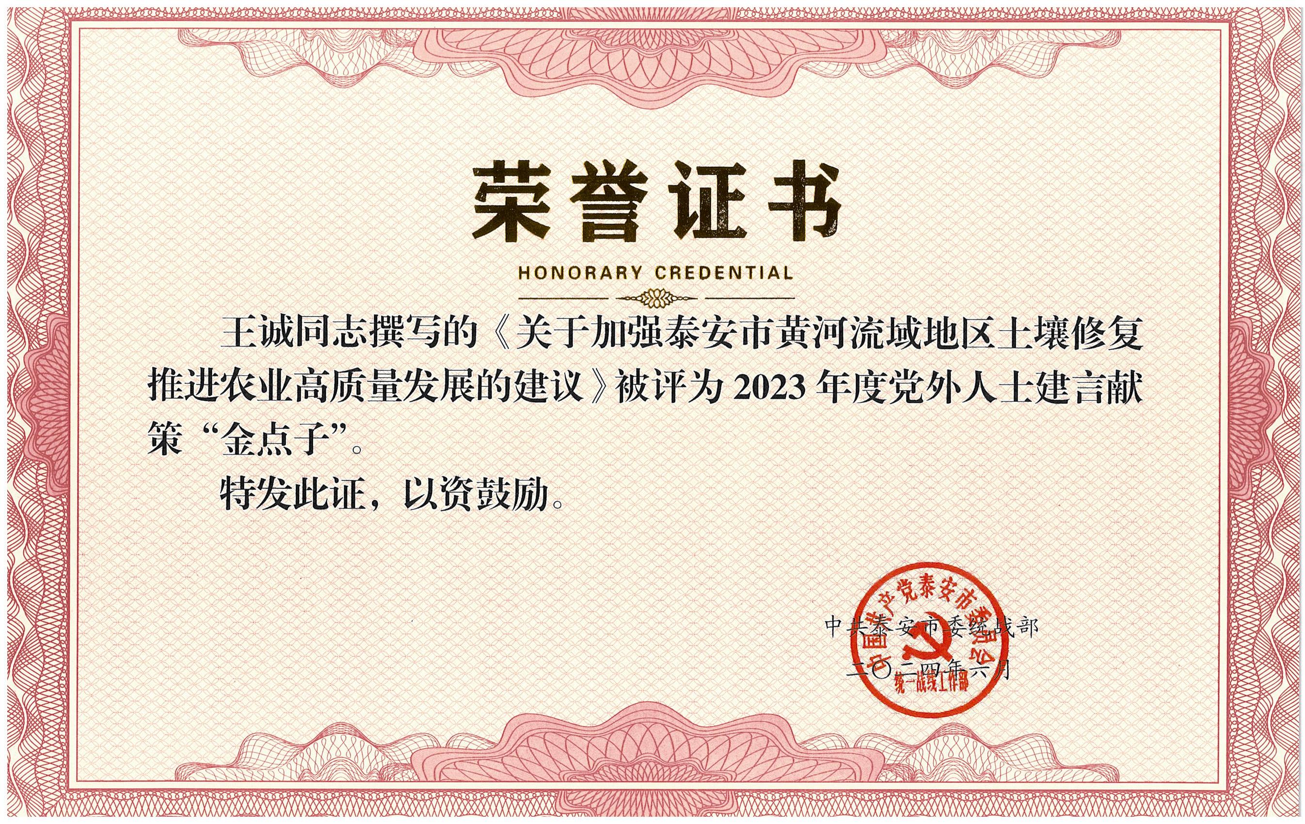 發(fā)布時間:[2024-7-9 17:52:5] 瀏覽量:3505次會上公布了《關(guān)于2023年度黨外人士建言獻(xiàn)策工作先進(jìn)典型的通報》,王誠董事長被評為2023年度黨外人士建言獻(xiàn)策“建言先鋒”,撰寫的《關(guān)于加強(qiáng)泰安市黃河流域地區(qū)土壤修復(fù)推進(jìn)農(nóng)業(yè)高質(zhì)量發(fā)展的建議》被評為2023年度黨外人士建言獻(xiàn)策“金點(diǎn)子”。