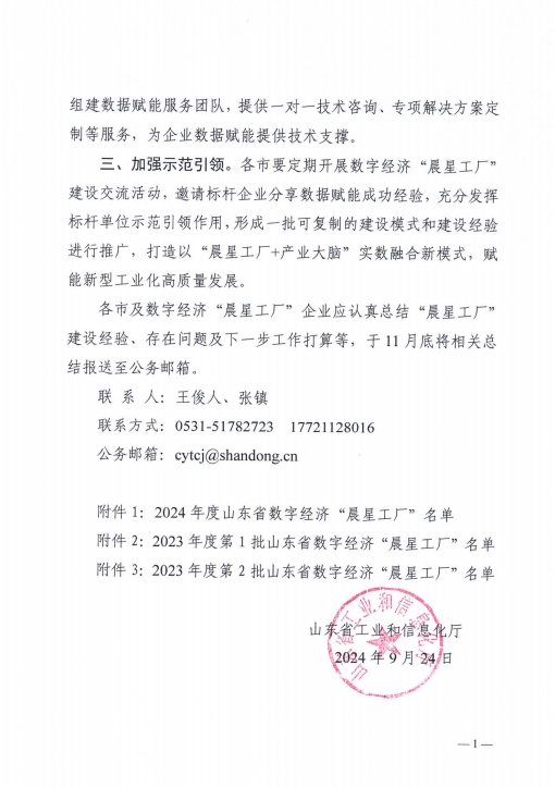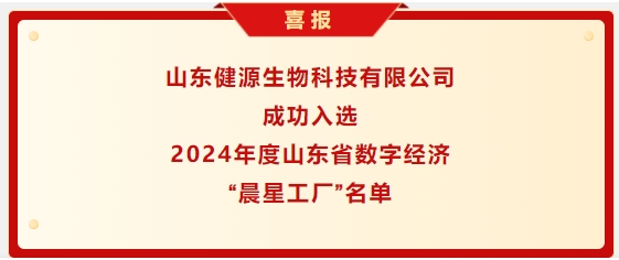近日,山東省工信廳下發《關于公布2024年度山東省數字經濟“晨星工廠”名單的通知》。經單位申報、市局推薦審查、專家評審等程序,山東健源生物科技有限公司成功入選2024年度山東省數字經濟“晨星工廠”名單。