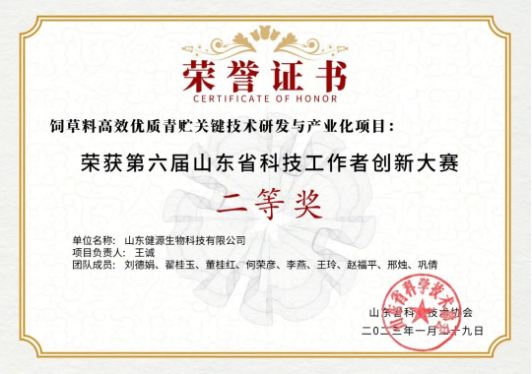2023-3-3 山東健源生物榮獲第六屆山東省科技工作者創(chuàng)新大賽二等獎