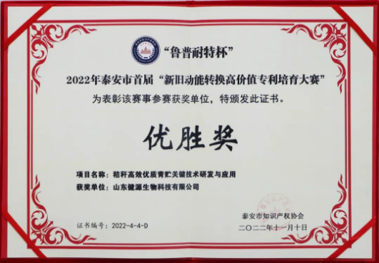 2023-4-4 祝賀山東健源生物榮獲2022年泰安市首屆“新舊動能轉(zhuǎn)換高價值專利培育大賽”優(yōu)勝獎