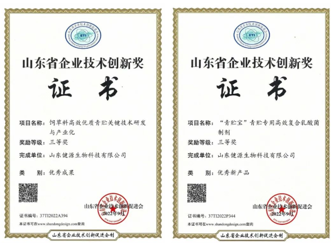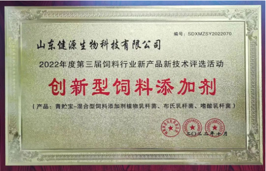 2022-11-1 祝賀山東健源生物(青貯寶)產品榮獲“2022年度創新型飼料添加劑”榮譽稱號