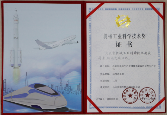 祝賀山東健源生物參與完成的《高效飼草料生產關鍵技術裝備的研發與產業化》項目榮獲2022年度機械工業...