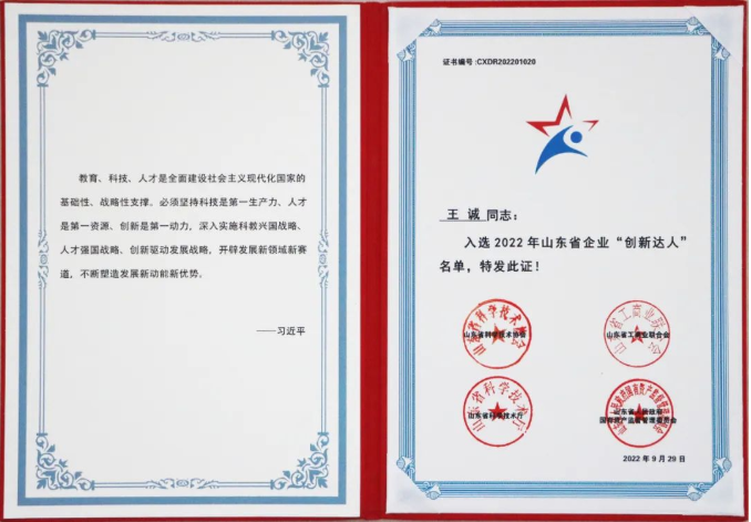 2022-11-24 祝賀山東健源生物董事長王誠榮獲2022年山東省企業“創新達人”稱號