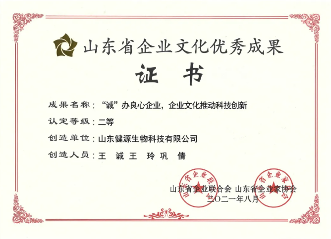 2021-12-20 熱烈祝賀山東健源生物科技有限公司榮獲首屆山東省企業文化優秀成果二等獎