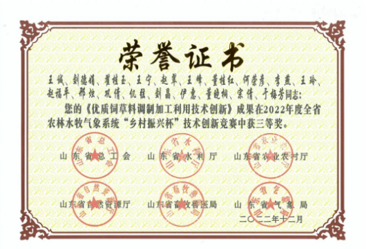 2023-7-15 山東健源生物榮獲2022年度全省農林水牧氣象系統(tǒng)“鄉(xiāng)村振興杯”技術創(chuàng)新競賽三等獎