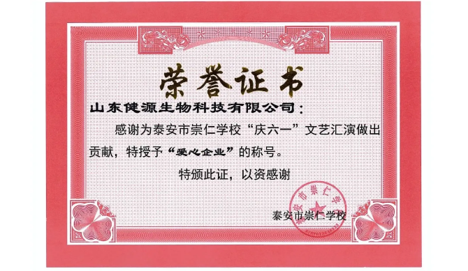 山東健源生物科技有限公司總經理助理兼辦公室主任王玲女士代表公司出席活動,精心為同學們準備了書包、文具盒等兒童節禮物,并被泰安市崇仁學校授予“愛心企業”稱號,作為一家有擔當、有責任感的企業,山東健源生物積極參與社會公益活動,用實際行動為同學們帶來溫暖,同時希望同學們自強不息,立志成才,不畏艱難攀登知識高峰,腳踏實地實現人生夢想。